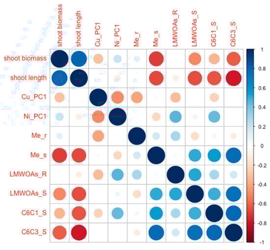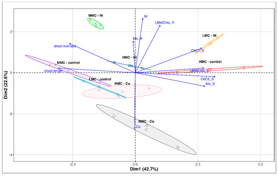 The first dimension (Dim1, 42.7% of the variance) primarily differentiated samples based on biomass and shoot length, which negatively correlated with metabolite content and metal accumulation in shoots (C6C3_S, LMWOAs_S, Me_S). The second dimension (Dim2, 22.6% of the variance) reflected the influence of toxic metals (Ni, Cu) and separated plants based on metabolite presence and metal accumulation in roots (LMWOAs_R, Me_R).