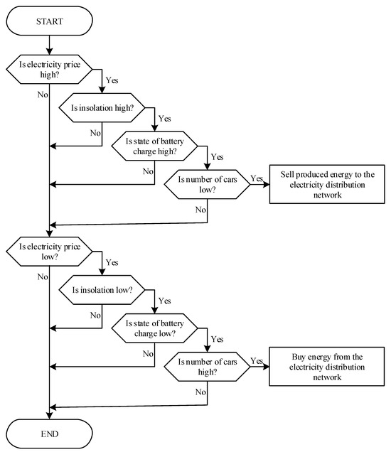 As shown in Figure 2, the decision about selling the energy to the electricity distribution network, or buying the energy from the electricity distribution network is made based on data (electricity price, level of insolation, state of battery charge, and number of cars) collected from different subsystems into one central place. Information about the electricity price is taken from the electricity trading platform, information about the level of insolation is taken from the photovoltaic panels (which provide the energy from renewable sources to the station), and information about state of the battery charge is taken from the subsystem for the remote control of smart batteries, while information about the number of cars is taken from the subsystem for the remote control of electric vehicle chargers.
