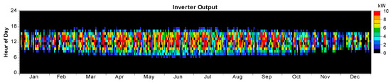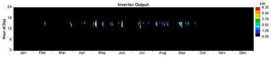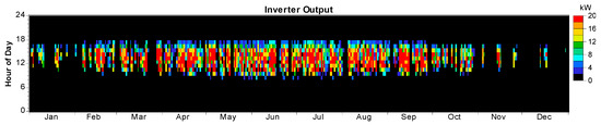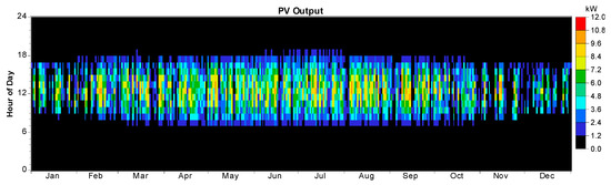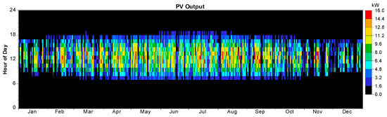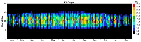 Table 22 shows the capacity of the photovoltaic panels, as well as hours of operation and total electricity production over the course of a year, and Figure 22 shows in more detail the output values of the power of the photovoltaic panels (PV Output) by month and period of the day (Hour of Day) in which they were active.
