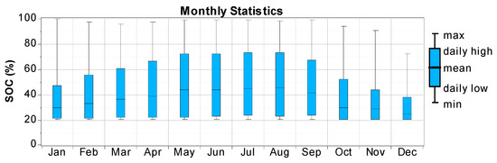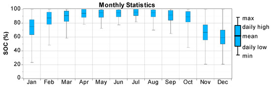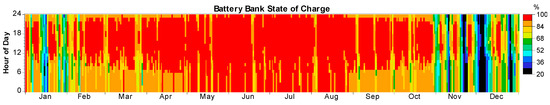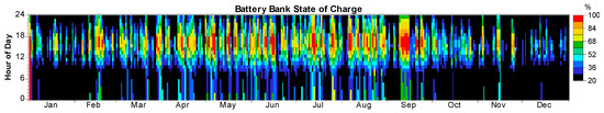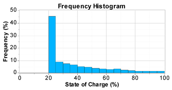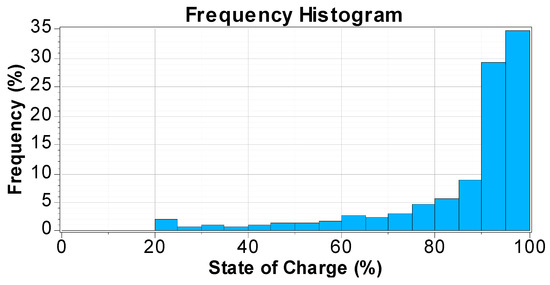 Table 15 shows the characteristics of a battery composed of battery cells used in the simulation. In order to present the charging characteristics of the batteries in more detail, Figure 16, Figure 17 and Figure 18 show the Frequency Histogram of the percentage of battery charge, Monthly Statistics of the battery charge (SOC—State of Charge) by month, and the state of charge (Battery Bank State of Charge) of the batteries by month and period of the day (Hour of Day).