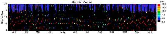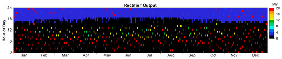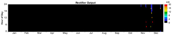 From Table 16, we see the operation statistics of the three-phase hybrid inverter, Figure 19 shows the output power of the inverter (Inverter Output Power), i.e., the power of electricity that is delivered to the power distribution network, and Figure 20 shows the output power of the rectifier (Rectifier Output Power), that is, the power of electricity that is taken from the power distribution network, by month and period of the day.