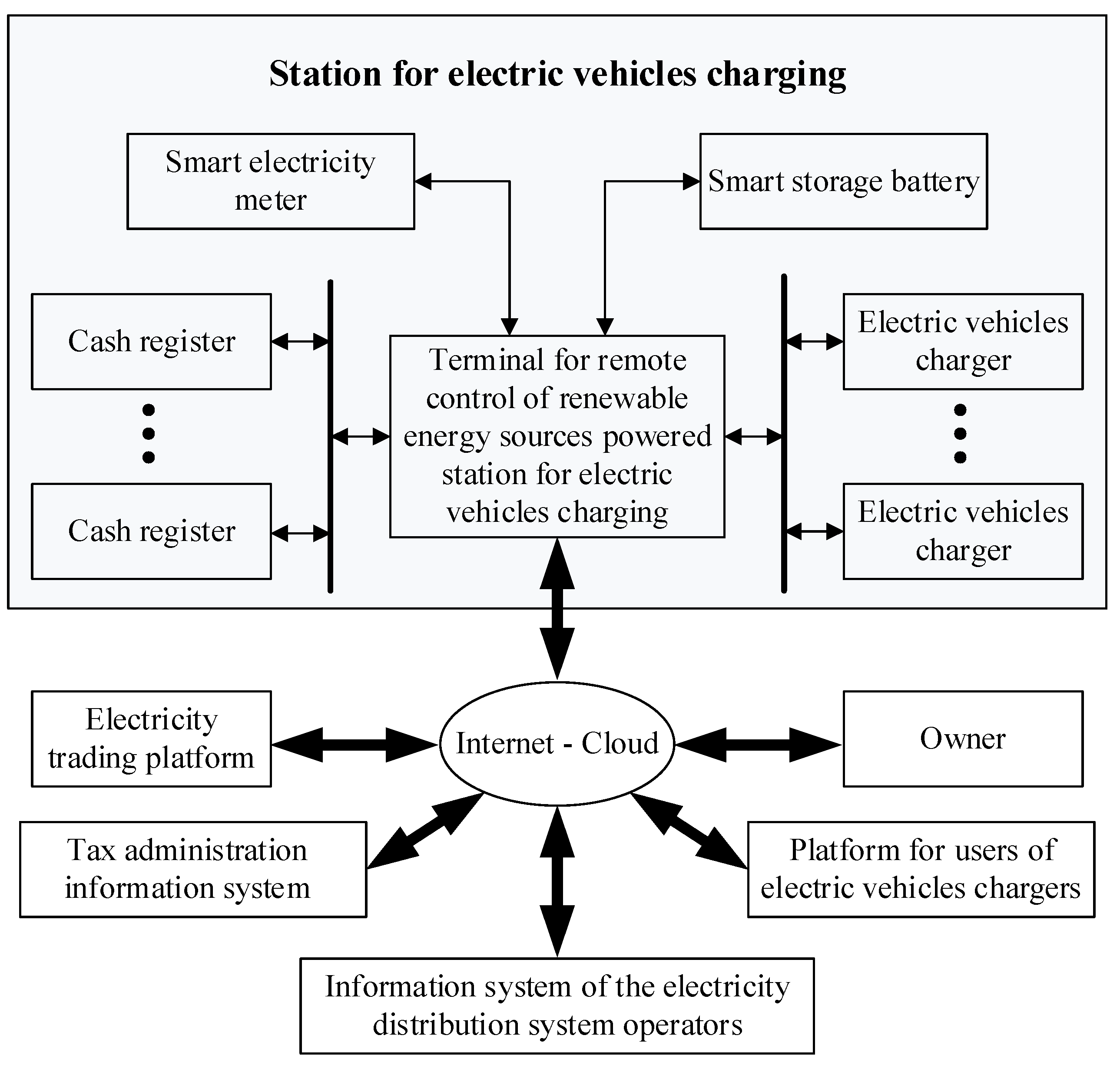 Block diagram of the architecture of a system for remote control of renewable-energy-source-powered, sustainable, energy-independent station for electric vehicle charging.