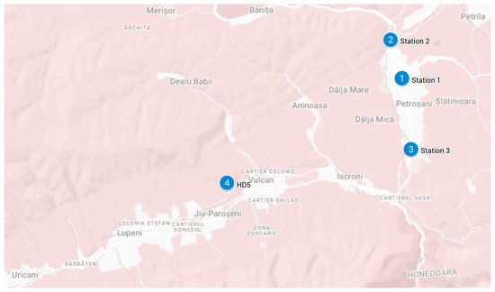 Local air quality monitoring is limited. Only one station (HD5), part of the National Air Quality Monitoring Network (RNMCA), is located near Vulcan rather than Petroșani (Latitude: 45.3727951, Longitude: 23.2779579). Although the RNMCA has over 100 stations across Romania, many—including HD5—frequently lack continuous data [5,43]. HD5 lies about 8 km from our Monitoring Station 3 and 10 km from Station 2.