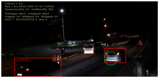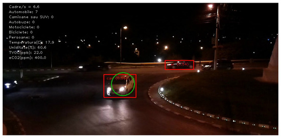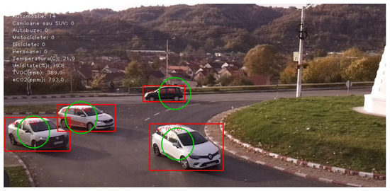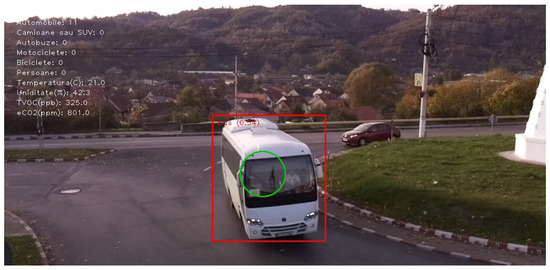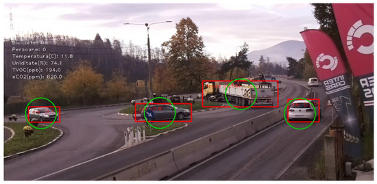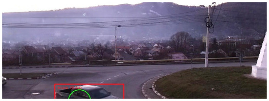 Image as captured by the first installed monitoring station at location No. 1. with the red box and green circle indicating vehicle detection by the counter algorithm.