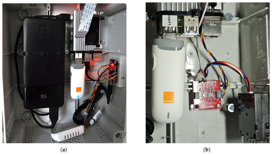 These images show different stages of development: (a) Analog sensors were used, connected to an Arduino Nano board. (b) Better sensor versions using serial communication directly with Raspberry Pi.