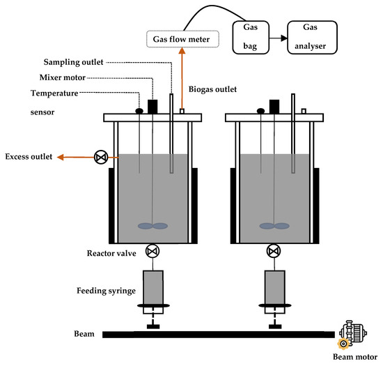 The AD system used in this study is an auto-fed semi-continuous system composed of two stainless steel reactors (Anaero Technology, Cambridge, UK) (Figure 1). Each reactor has an operational volume of 5 L and is equipped with a feeder composed of two syringes operated by a motor-driven beam. The feedstock is supplied to the reactors from the bottom through a feeder port, facilitated by the vertical motion of the feeding syringe’s piston. This design prevents air from entering the reactors, thereby mimicking the feeding conditions of full-scale anaerobic digesters. The syringes replicate the function of feed tanks in real-scale systems and enable the semi-automatic delivery of heterogeneous feedstock without the clogging issues often encountered with laboratory-scale feeding pumps. Moreover, because both syringes are actuated by the same lifting beam, the system ensures identical feeding conditions in both reactors, allowing for a fair comparison of the performance of the two inocula. Effluent is automatically directed into 1 L digestate tanks connected to the reactor discharge outlets. Maintaining a temperature of 55 °C is achieved by using electric heating jackets enveloping the external walls of each reactor. Agitator speed and reactor temperature are automatically regulated and monitored by a programmable logic controller (PLC) unit (Anaero Technology, Cambridge, UK). Cumulative and instantaneous biogas production is continuously and punctually measured and converted to standard conditions (273 °K, 1013.35 mbar) by a gas flow meter using the liquid displacement method involving diluted HCl (pH = 2). The collected data are then stored as CSV files by the PLC controller. The produced biogas is collected within 25 L gas sampling bags (VWR, Radnor, PA, USA) before undergoing analysis using a gas analyzer equipped with electrochemical sensors for CH4, CO2, O2, and H2S (ppm) (SWERIN, Gütersloh, Germany).