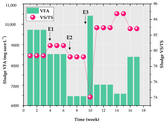 Organic content and total volatile fatty acids (VFA) of the seven loads of sewage sludge (SS). Pink circles represent the volatile solids/total solids (VS/TS) of each of the seven loads of SS for each week of the experiment. E1, E2, and E3 denote the three feeding events applied in weeks 4, 7, and between weeks 9 and 10.