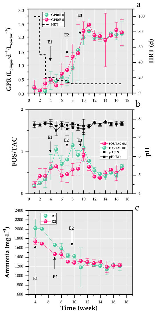 Variations of weekly means of gas production rate (GPR) and hydraulic retention time (HRT) (a), FOS/TAC and pH (b), and ammonia (c) in reactors R1 and R2.
