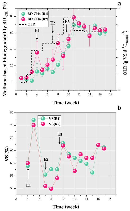 Variations of weekly means of methane-based biodegradability (BdCH4) with the organic loading rate (OLR) (a) and volatile solid (VS) removal efficiency (b) in R1 and R2.