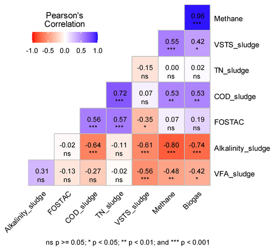 Statistical analysis was conducted using R language version 4.2.1. An independent t-test was applied with the ‘tidyverse’ package [39] to compare the weekly means of GPR, BdCH4, and FOS/TAC between the two reactors, with a significance level set at 0.05. Additionally, Pearson correlation analysis was performed using the ‘metan’ package [40] to assess the impact of influent variability on GPR, FOS/TAC, and BdCH4 in R1 and R2. A correlation matrix, along with the corresponding significance levels, was then generated.
