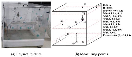 The experiment was conducted in an environmental chamber with dimensions of 1 m in length, width, and height. The environmental chamber’s airtightness was checked prior to testing. A circular platform was installed on one side wall of the environmental chamber to hold the alcohol lamp. Nine laser particle sensors numbered 1# to 9# were arranged in three layers, with 3#, 4#, and 8# belonging to the upper layer, 5#, 6#, 7#, and 9# in the middle layer, and 1# and 2# in the lower layer. Sensors 1# to 7# monitored wall-adjacent particulate mass concentrations at different heights, while 8# and 9# tracked concentrations directly above the combustion source and at the center of the chamber, respectively. All measurements were performed using D5 particle detectors with a range of 0–5000 μg/m3, ±10% accuracy, and 1 Hz sampling frequency. These sensors were newly purchased and calibrated by the manufacturer. Figure 1 shows the experimental devices.