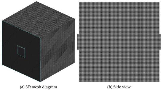 The bottom center of the cube model was taken as the origin to establish a coordinate axis. The particle injection source was set to replace the fuel combustion release source at the coordinate (0, −0.4, 0.6). Taking the directly facing ventilation as an example, the numbers cells and nodes in the mesh are 1,001,600 and 1,032,065, respectively. The mesh was created using a multi-zone method with the hexahedral grid type. The grid information under the ventilation schemes is completely identical. The number of mesh cells and nodes under closed conditions is slightly less than that under ventilation schemes. Figure 3 shows the grid diagrams of the chamber under the directly facing ventilation.