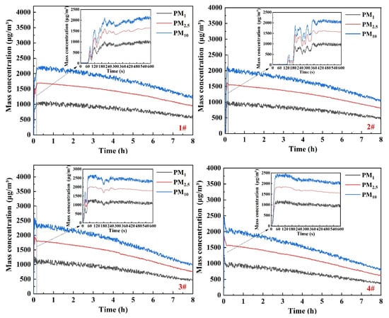 Due to the effect of gravity, the particles gradually settle after about 1 h, resulting in a gradual decrease in concentration. Correspondingly, the concentrations of PM1, PM2.5, and PM10 decrease by approximately 540–830, 710–1170, and 1020–1640 μg/m3, respectively. The concentration of larger particles decreases more, which is consistent with the results in reference [39].