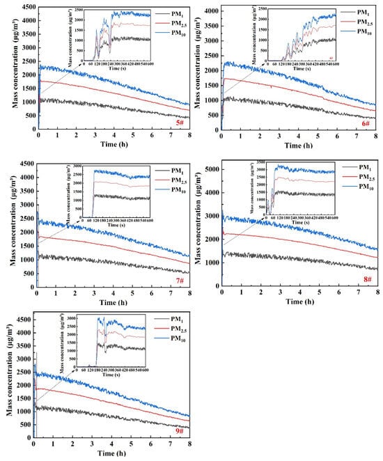 The time at which the particle mass concentrations for all measuring points rise to the peak are related to the distance from the combustion source. Points 3#, 4#, and 8# nearest to the source increase rapidly, peaking within about 60–90 s. All measuring points reach the peak concentrations within 420 s, maintaining stable levels for approximately 1 h thereafter.