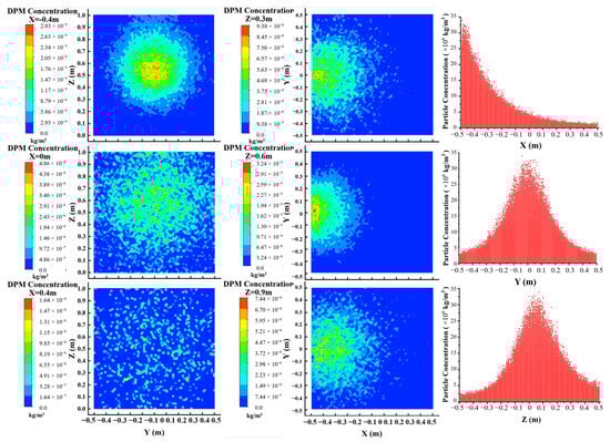 It is easily seen that the concentration of the particles at and near the combustion source is higher and more concentrated compared to other areas. The particle mass concentration at the X = −0.4 m section is higher with the peak value of 2.931 × 10−5 kg/m3 and more concentrated than at the X = 0 m and 0.4 m sections. This is because the particles diffused from the jet source cannot be evenly distributed throughout the space within a short time. Similarly, the particle mass concentration at the Z = 0.6 m section is higher and more concentrated than those at the Z = 0.3 m and 0.9 m sections.