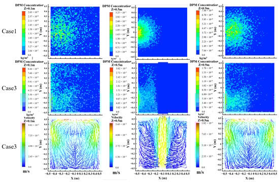 Considering that the facing ventilation inlet is located at Z = 0.5 m, the particle mass concentration distribution and velocity contour at the Z = 0.1, 0.5, and 0.9 m sections for case 1 and case 3 are compared, as shown in Figure 6. It is evident that the particle concentration at the Z = 0.5 m section for case 3 is lower and more dispersed than that for case 1. This is because some particles at the Z = 0.5 m section are directly carried away within the range of the ventilation inlet area. However, the particle concentrations at the Z = 0.1 m and 0.9 m sections for case 3 is higher than that for case 1. It is seen from the figure that airflow recirculation occurs both above and below the chamber during ventilation, moving towards the inlet direction. This recirculation pattern reduces both particle removal through the outlet and the deposition ratio of particles.