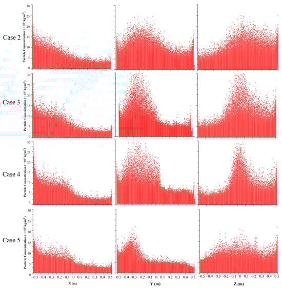 It is also found that the concentrations of the particles along the Y-axis and Z-axis direction are generally normally distributed. However, the concentration of the particles along the X-axis direction shows basically half of a normal distribution. As can be seen from the scatterplot of the X-coordinate, the particle concentration at X = −0.45 m is higher than that at X = 0.4 m. The reason is that the particles rebound after colliding with the wall, causing an increase in concentration near the X = −0.45 section.