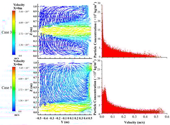 Figure 8 compares the velocity fields and the relationship between flow velocity and particle concentrations at an inlet velocity of 0.4 m/s for directly facing ventilation and side ventilation. Under directly facing ventilation, two vortices form along the upper and lower sides of the ventilation airflow position, hindering the outflow of some particles from the outlet. In contrast, the main airflow under side ventilation follows the bottom direction and then moves upward along the right wall. Additionally, a top-down airflow is generated within the chamber and flows out together with the main airflow, facilitating the effective removal of the particles. The scatterplot of the particle concentration versus velocity reveals that the low velocity observed during directly facing ventilation corresponds to higher particle concentrations than those observed during side ventilation.