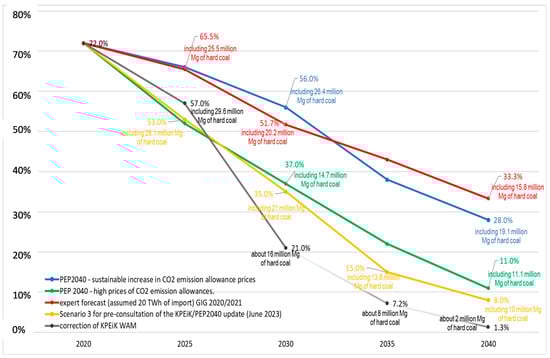 At the Central Mining Institute in 2021–2022, expert research was conducted on forecasting scenarios for energy policy, in particular the structure of the energy mix and the risk of achieving the assumed level of its decarbonization []. The scientific approach to the issue of forecasting is based on a number of forecasting methods and ways of classifying them. One of the basic divisions is the division into quantitative and qualitative methods. Quantitative methods are based primarily on forecasting models built on the basis of available statistical data. They allow for the assessment of the development of the value of the forecast variable and explanatory variables in the future. It is worth noting that quantitative models work well if there are no significant changes in the company’s strategy and environment. When using quantitative methods, it is always necessary to decide whether, in the forecast horizon, there will be no phenomena that significantly affect the subject of the forecast and its environment [,,]. Qualitative (heuristic) methods are based on the judgments of experts (individual or groups of experts). In forecasting based on these methods, we are not dealing with a formal model, but primarily with a mental model. Survey methods, the method of successive approximations, and the Delphi method are such models. Despite the fact that they are subjected to systematic error, they perform better when there are significant changes affecting the operation of the subject and questioning the rationality of using statistical data. The following critical analysis of the energy mix for Poland in the 2040 perspective presented in the draft of the new NECP was conducted at the Central Mining Institute using expert methods. Its purpose is to indicate the risk of not achieving the assumed climate targets by the assumed date and the need to prepare an alternative scenario in case the risk materializes [,,].
