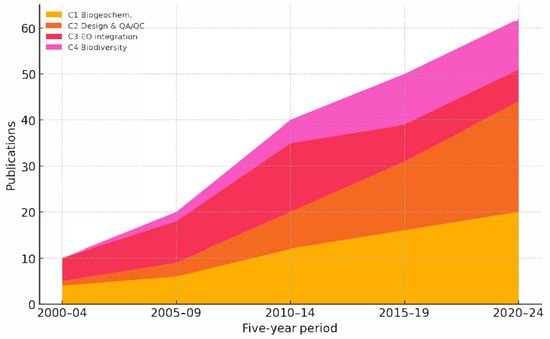 Figure 1 demonstrates a steady expansion of citizen science output related to soil, from ≈10 publications in 2000–2004 to >60 in 2020–2024. Growth is uneven: EO integration studies (C3) peak in 2010–2014 and then decline; biogeochemical work (C1) rises steadily and now accounts for one-third of recent output; design/QA studies (C2) accelerate five-fold after 2010, reflecting a growing focus on data standards; biodiversity topics (C4) emerge after 2005 and stabilize post-2015. C3 EO integration dominates the formative period (2000–2014), peaking at 15 papers in 2010–2014, but its share contracts thereafter as remote sensing validation becomes routine.