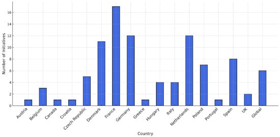 Quantitative analysis: Numerical data on variables including project scale (local, regional, or national), community size, and monitored soil parameters (e.g., soil organic carbon, nutrient levels, and pollutants) were compiled and analysed using descriptive statistical methods. Frequency tables and cross-tabulations were generated to reveal trends and recurring patterns [36]. Figure 2 shows the number of initiatives collected by partners from participating countries.