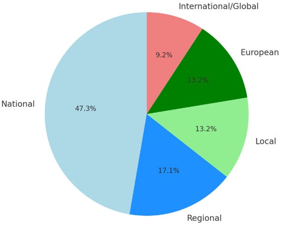 Figure 3 summarizes the spatial scope of the citizen science initiatives analysed (see Supplementary Materials File S1 for source data). Five mutually exclusive categories were used, as follows: local (single site or municipality), regional (sub-national, e.g., province or river basin), national, European (multi-country within the EU), and international/global (worldwide platforms). The distribution reveals a clear predominance of national initiatives, which account for 47.4% of the sample. Regional efforts represent 17.1%, while local and European initiatives each make up 13.2%. International or global projects are the least common, comprising 9.2% of the total. This pattern indicates that most initiatives are implemented at the national level to support country-wide monitoring needs, while sub-national and local schemes play a complementary role. European and global programmes, though fewer, provide broader policy alignment and cross-border comparability.