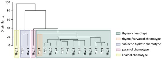 Cluster analyses were performed on the base of GC-MS normalized data representative of our experimental population (N = 17), aiming to assess the similarity between individuals and the presence of groups having different expressions of terpenes in the wild thyme population investigated. The dissimilarity data matrix was built using the Manhattan distance [31]. Subsequently, hierarchical clustering was applied to the obtained distance matrix by using a single-linkage method, which merges clusters based on the minimum distance between points from different groups. Cluster outcomes were represented by a dendrogram, and the goodness of their fit was tested by using Cophenetic Correlation Coefficient (CCC), considering results of a CCC > 0.8 as accurately representing the data. Preliminary silhouette index analyses were conducted to obtain the optimal number of clusters describing the population. The subdivision into groups based on volatile chemical profiles, obtained through the cluster analysis, was used to verify if a statistically significant difference between groups exists. For this analysis, a new dissimilarity matrix was constructed using the Bray–Curtis method and the Analysis of Similarities (ANOSIM) test with permutations (np = 999) was conducted. The R statistics of this test were used to assess if a difference exists among the groups (where R ≈ 0 indicates little or no separation, and R ≈ 1 indicates strong group separation). The results were considered significant if the associated p value was less than 0.05 [32,33].