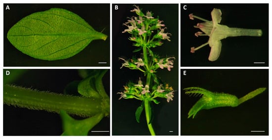 The morphological parameters of wild thyme. The images illustrate key morphological characteristics analyzed in this study, including the wild thyme leaf (A), flowering part (B), corolla (C), stem (D), and calyx (E). The scale bar (1 mm) is reported for each image.