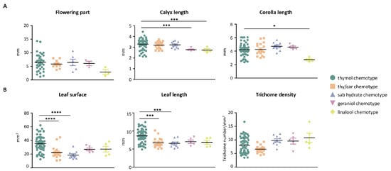 Morphological differences among the wild thyme chemotypes. (A) Graphs show three key morphological traits of the wild thyme flower: the flowering part length, calyx length, and corolla length. (B) Leaf-related parameters such as leaf surface area, leaf length, and trichome density are represented in the graphs. The reported values were obtained from at least three independent measurements per plant. Significant differences, calculated by comparing the various chemotypes to the thymol chemotypes are indicated as * < 0.05; *** < 0.0001, and **** < 0.00001.