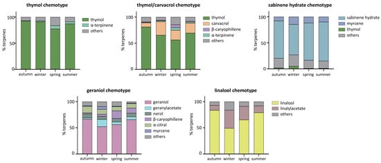 Seasonal variation in wild thyme plant chemotype. The stacked bar chart illustrates the percentage composition of the main terpenes, calculated based on the total identified terpenes found in the reported season. Each graph represents a characteristic plant of a specific chemotype.