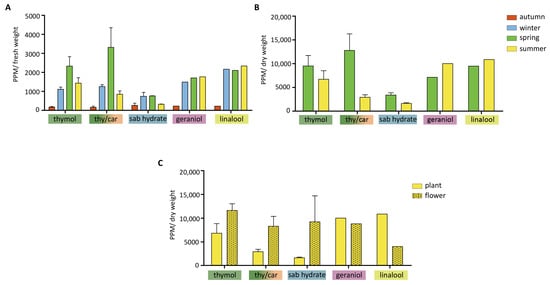 Wild thyme balsamic period. (A) The graph shows the total terpene content (expressed in PPM) relative to fresh weight across different seasons. The plants are categorized by chemotype, as indicated on the x-axis. (B) For the spring and summer seasons, the bars show the quantitative terpene production of the plants relative to their dry weight, grouped by chemotype. (C) The bar graph presents the terpene content in both the plant and flower samples collected during the flowering period.
