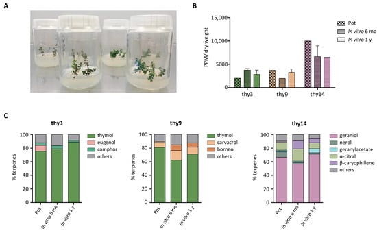 The in vitro propagation of wild thyme. (A) A representative image of in vitro plant collection. (B) The bar graph illustrates the total terpene content in wild thyme, normalized to the plant’s dry weight. Terpene amounts are shown for potted plants, as well as for plants grown in vitro for 6 months (mo) and 1 year (y), respectively. (C) The stacked bar chart shows the percentage composition of the main terpenes identified in the analyzed wild thyme plants. The analysis includes potted plants and those cultivated in vitro for 6 months and 1 year, respectively.