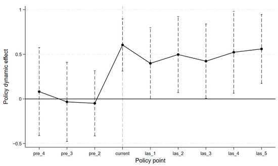 The parallel trend test should be passed to use the double-difference method for the empirical analysis. This paper defines the year 2016 as current, the year before policy implementation as pre_1, the two years before policy implementation as pre_2, the three years before policy implementation as pre_3, and the four years before policy implementation as pre_4. Likewise, one year following the policy’s introduction can be designated as las_1, and so on to produce las_2, las_3, las_4, las_5. On this basis, pre_1 is used as the base period. Referring to the practice of Beck et al. [37], there are several main steps. First, the mean value before the implementation of the policy is calculated. Specifically, since pre_1 is the base period and has been deleted, three periods are remaining before the policy is implemented, and the mean value before the policy is obtained by calculating the sum of the coefficients of the remaining three periods before the policy is implemented and dividing by the number of periods. Next, the regression coefficients and confidence intervals for each period are de-meaned to deal with the pre-policy trend as best as possible. Finally, the new coefficient after the de-mean is extracted, and the trend graph is drawn. Figure 1 displays the results of the parallel trend test. Before the construction of the pilot zone, the experimental and control groups did not differ significantly, and the regression coefficients of pre_4, pre_3, and pre_2 are not significant. However, after the construction of the pilot zone, the regression coefficients become significant overall, satisfying the parallel trend test, excluding the differences in the ESG performance of heavily polluting enterprises caused by different time trends, and capable of identifying the policy influence of the construction of the pilot zone using the double-difference method.