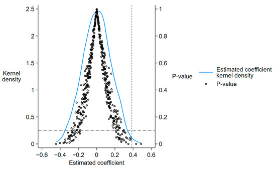 Although the parallel trend test proves that improvements in the environmental, social, and governance performance of heavily polluting firms are driven by policy for the construction of pilot zones, to avoid the benchmark regression results caused by some chance factors, referring to La Ferrara et al. [38], random sampling is used to construct sham experimental and control groups. The kernel density and p-value distribution of the estimated coefficients in the 500 times placebo test for the experimental and control groups that are randomly selected are presented in Figure 2. The figure shows the kernel density and p-value on the y-axis, the estimated coefficients of the randomly generated policy on the x-axis, the true estimated coefficients on the dashed line parallel to the y-axis, and the dashed line parallel to the x-axis represents the 10% p-value level, where the curve is the kernel density distribution of the estimated coefficients, and the scatter represents the p-value corresponding to the estimated coefficients. The regression coefficients obey a normal distribution and are concentrated around 0. There is a certain difference between the estimated values of true coefficients and the kernel density distribution of false regression coefficients. Moreover, the p-value of the vast majority of the regression coefficients is greater than 0.1, which is not significant. Therefore, the benchmark regression results are not affected by other unobservable factors.