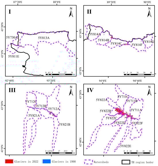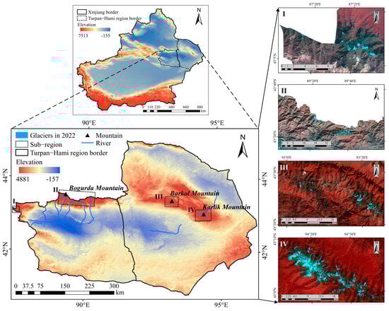Location and glacier distribution in the Turpan–Hami (TH) region. Glacier zones are categorized into four areas: I, glaciers in the easternmost Karawuchen Mountains; II, glaciers in the easternmost Bogurda Mountains; III, glaciers in the Barkol Mountains; and IV, glaciers in the Karlik Mountains. Sub-region images are derived from Landsat 5 imagery from 1994, using an RGB (6-2-1) band combination. Administrative district boundaries are based on China Map—Map Approval No. GS (2019) 1822.