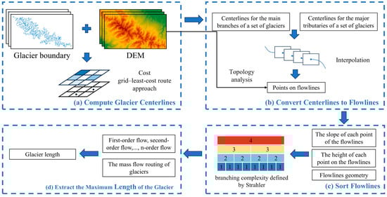 - Glacier Length Extraction: This study uses the flowline and catchment extraction module in the OGGM [30] to extract the maximum length of glaciers (hereinafter referred to as glacier length). Figure 2 shows the module flow chart. This module is based on the algorithm proposed by Kienholz et al. [41], which derives a set of central flowlines and branch flowlines for glaciers using the “cost grid–least-cost route approach” method [41]. Compared to other glacier length extraction methods, this module can calculate multiple central flowlines for a glacier area and define a main flowline to ensure the extraction of the maximum glacier length [30,41]. Compared to other glacier length extraction methods, this module can calculate multiple central flowlines for a glacier area and define a main flowline to ensure the extraction of the maximum glacier length.