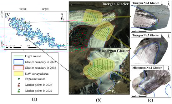 Comparison between Google Earth and UAV data of the marginal retreat of Tuergan Glacier and Miaoergou Glacier in Subregion IV. (a) Glacier boundaries in 2003 and 2022; (b) Google Earth images from September 2003; (c) drone images of the terminals of Tuergan No. 1 Glacier, Tuergan No. 2 Glacier, and Miaoergou No. 2 Glacier.