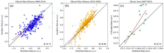 Comparison of modeled glacier data with other datasets: (a) comparison of the glacier mass balance modeled data and geodetic data from 2000 to 2010; (b) comparison of the glacier mass balance modeled data and geodetic data from 2010 to 2020; (c) comparison of the glacier area modeled data from 2007 to 2022 with the calculated data. In each subplot, the red dashed line represents the fitted trend line of the scatter points.
