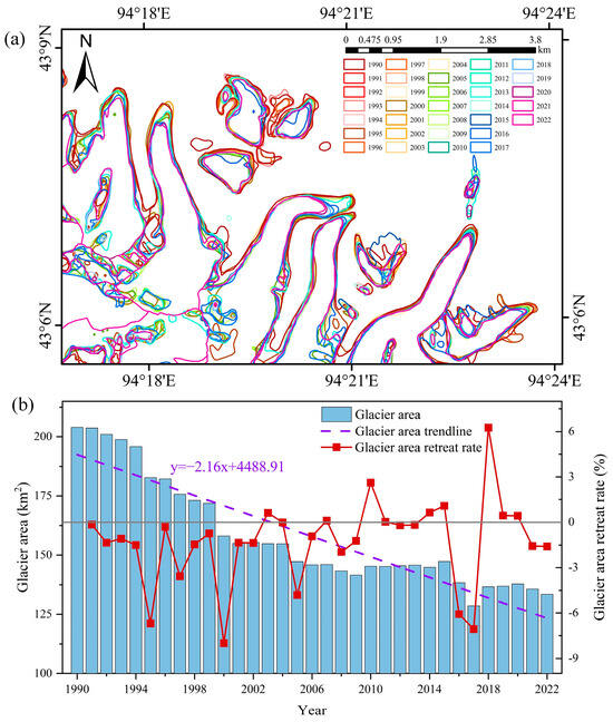 Glacier changes in the TH region from 1990 to 2022. (a) Changes in glacier boundaries in some areas of TH region from 1990 to 2022 and (b) changes in glacier area and corresponding retreat rates in the TH region over the same period.