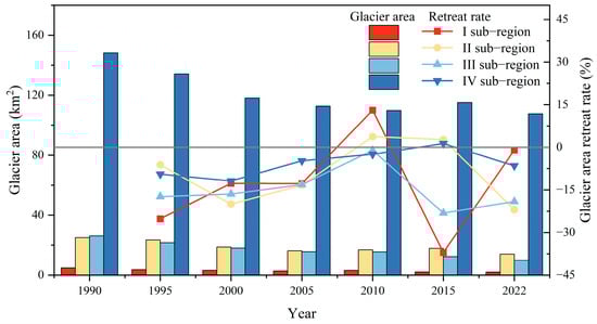 Glacier area and retreat rates across four subregions from 1990 to 2022.