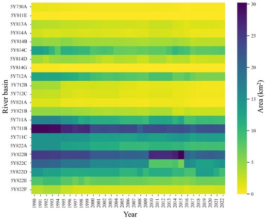 From a watershed perspective, glaciers within the study area are distributed across 22 eighth-level watersheds (Figure 6). Watershed boundaries were delineated with high precision using data from the Second Glacier Inventory of China and DEM elevation data. The annual distribution area changes in each subregion are represented by heatmaps (Figure 7 and Figure 8), with the overall distribution and variation of glaciers from 1990 to 2022 summarized in Table 7.