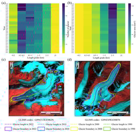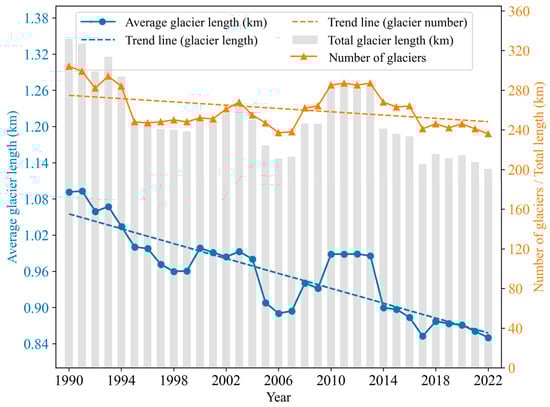 The number of glaciers exhibited a notable decline alongside reductions in glacier area, decreasing from 304 in 1990 to 236 in 2022—a loss of 68 glaciers, or 22.37%. This trend was most pronounced among small glaciers (≤0.1 km2), which decreased from 126 to 95, a reduction of 31 glaciers. Nearly all glaciers that disappeared entirely were within these smaller size categories, underscoring their heightened vulnerability to a warming climate and their rapid rate of melting. It is worth noting that large glaciers (≥5 km2) also showed significant retreat, with their number decreasing from 7 glaciers to 1 glacier, and their area shrinking from 45.66 km2 to 7.22 km2, a decrease of 18.84%. These findings highlight that, although larger glaciers respond more gradually to climatic shifts, their accelerated retreat can lead to profound impacts.
