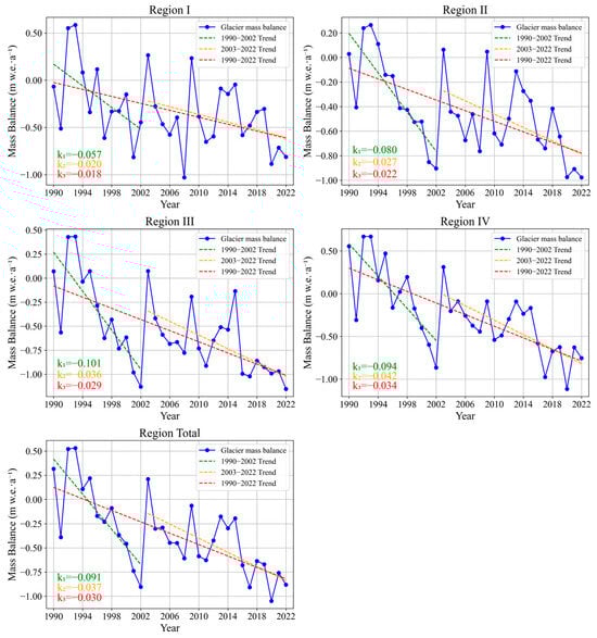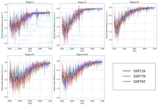 The mass balance projections for individual glaciers in the Turpan–Hami region, generated by the OGGM, were calibrated using the 2000–2020 period-averaged mass balance data from the global glacier mass balance change dataset [8], following a method similar to that of Xiao et al. [52] in the southeastern Tibetan Plateau. Validation was subsequently performed by comparing the modeled annual mass balance against the global dataset for the 2000–2010 and 2010–2020 periods (Figure 4a,b). The analysis showed the following results: Between 2000 and 2010, the correlation was 0.73, with a MAE of 0.188 m w.e. From 2010 to 2020, the correlation increased to 0.86, with a MAE of 0.189 m w.e. These results suggest that the OGGM provides dependable mass balance estimates for glaciers in the Turpan–Hami region. The increasing correlation over time suggests improved model accuracy, while the relatively low MAE values further support the model’s effectiveness in capturing interannual variations and trends in mass balance.