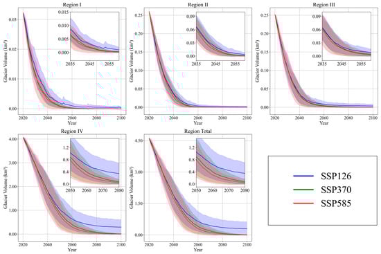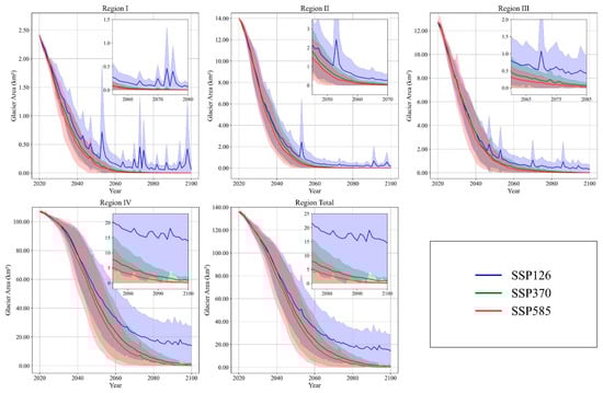 Due to the significant uncertainty in the OGGM’s glacier data prior to the “inventory date” based on the RGI dataset, this study uses data after the inventory date for validation. Specifically, the OGGM results from 2007 to 2022 were compared with calculated glacier area data. The results indicate that the correlation coefficient is 0.71, with a MAE of 4.10 km2 (Figure 4c). While the accuracy metrics reveal some error between the OGGM modeled results and the calculated values, the relatively high correlation suggests that the model effectively captures the overall trend in glacier area changes. This implies that the model demonstrates a high degree of reliability when assessing the future trend of glacier area changes.