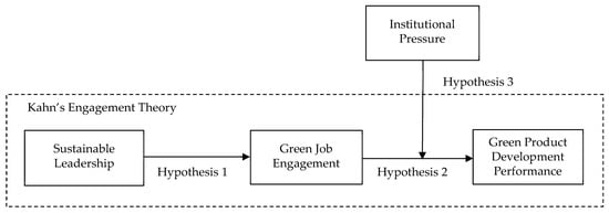 This article introduces green job engagement as an essential variable to open organizational management mechanisms to promote green product development performance. Job engagement refers to the behavior of employees investing all their resources into their job roles. Kahn [4] proposed the initial concept of job engagement and believed that role consistency, security, and availability are essential driving factors. This paper modifies Kahn’s [4] idea of job engagement to propose the concept of green job engagement to link the relationship between organizational leadership mechanisms and green product development performance. Indeed, past investigations lacked a complete theory to explain the formation mechanism of green product development performance, because most of these investigations use performance demand or market orientation to describe the performances of new product development [5,6,7]. The first purpose of this article is to use Kahn’s [4] employee engagement theory to develop green job engagement as an essential role in linking sustainable leadership and green product development performance.