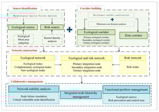 In this study, a dual-objective oriented approach of blind zone reduction and an ecological risk network is proposed. The research framework diagram is shown in Figure 2.