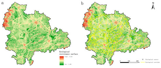 High ecological resistance areas are primarily concentrated in the Dabie Mountain Residue area (northeast of Wuhan) and the Wuyi Mountain Range (south of Fuzhou) (Figure 3a), characterized by high-altitude mountainous terrains. High resistance areas are also mostly located in Wuhan, Changsha, and Nanchang, which are located in the capitals or major cities of the three provinces, with landscape land dominated by construction land, complex roads, large populations, and frequent human activities. Low-resistance value areas are located in the non-urban areas of Poyang Lake Plain, Dongting Lake Plain and Jianghan Plain. These areas have flat topography and dense river networks. As shown in the ecological network diagram (Figure 3b), 643 ecological corridors were identified. They are mainly located in the Dongting Lake Plain area, Xuefeng Mountain Range, the southern part of Jianghan Plain, Jiuling-Mufushan Mountain Range, and Luoxiao-Jinggang Mountain Range.