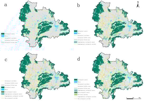 (a) Ecological blind zone, (b) complementary ecological source optimization, (c) optimization of additional ecological sources, (d) non-source patch optimization.