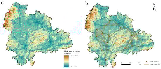 The resistance surface reflects the degree to which the substrate impedes the flow of matter and energy [28]. Usually, areas with higher elevations and slopes have a significant blocking effect on all kinds of material and energy flows [29]. As for land use, the ecological resistance surface and risk resistance surface of different land use types tend to show an opposite resistance value [30]. By defining different resistance factors (Table 4), it is possible to construct resistance surfaces that characterize the connectivity between network nodes [31]. Referring to the papers [32] and experts’ opinions, the resistance values of resistance factors and their weights are obtained.
