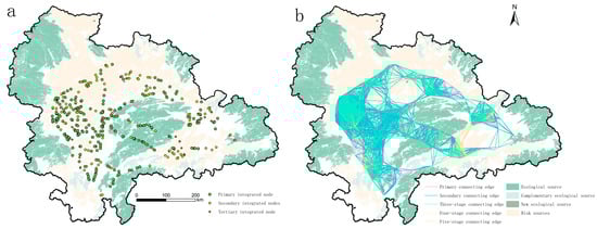 Nodes are critical for landscape connectivity and ecological function. Integrated nodes play a key role in maintaining the stability of the ecological network [25]. Integrated nodes are key areas where material exchange and energy flow intersect between ecologically important and ecologically sensitive areas, respectively. Therefore, an ecological approach must be adopted to improve the ecological environmental quality of each node to take protection and risk control measures to improve regional ecological security and reduce ecological risks.